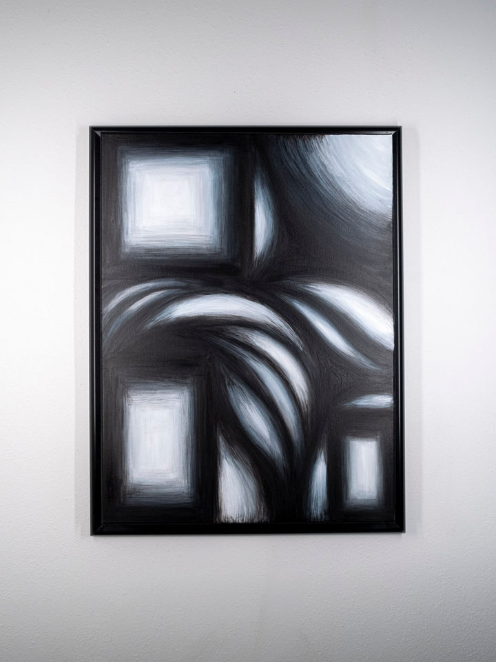 Of Realms (2024) is a numbered series of paintings exploring the relationship between entities and portals in an alternate dimension through light and darkness, where all possibilities are represented. Every form with vertices is a portal, and the currents of light are souls traveling and interacting within a dimension.
